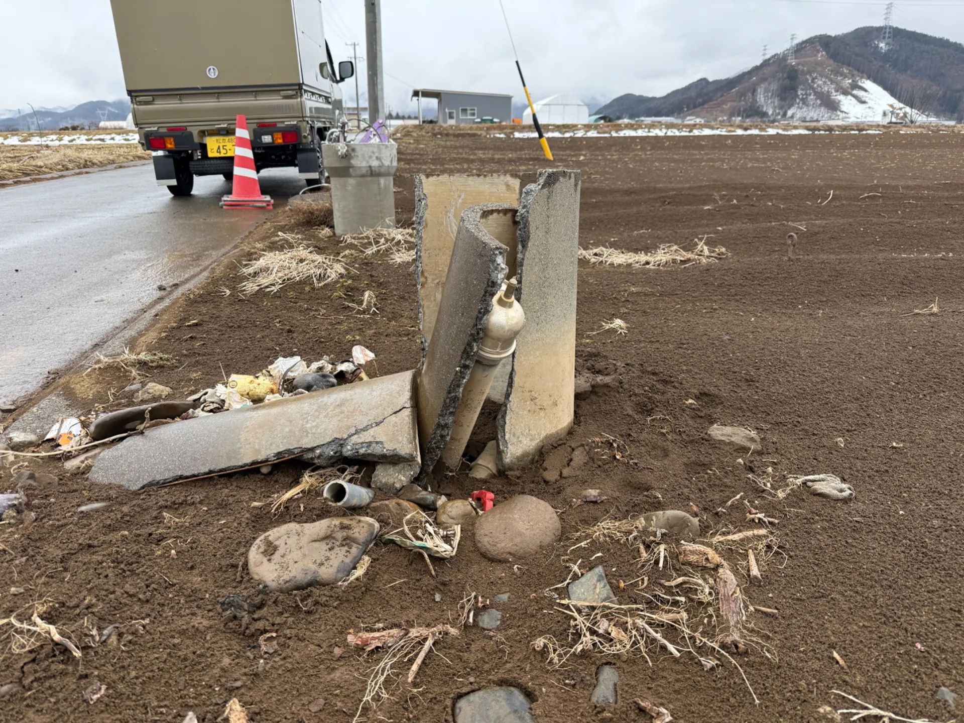 画像でもわかりますが、しっかりと曲がっておりました!保護用のコンクリートも破損しておりそこもしっかりと交換いたしました!!